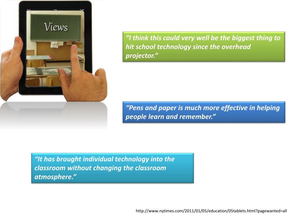 “I think this could very well be the biggest thing to hit school technology since the overhead projector.” “Pens and paper is much more effective in helping people learn and remember.” “It has brought individual technology into the classroom without changing the classroom atmosphere.” http://www.nytimes.com/2011/01/05/education/05tablets.html?pagewanted=all