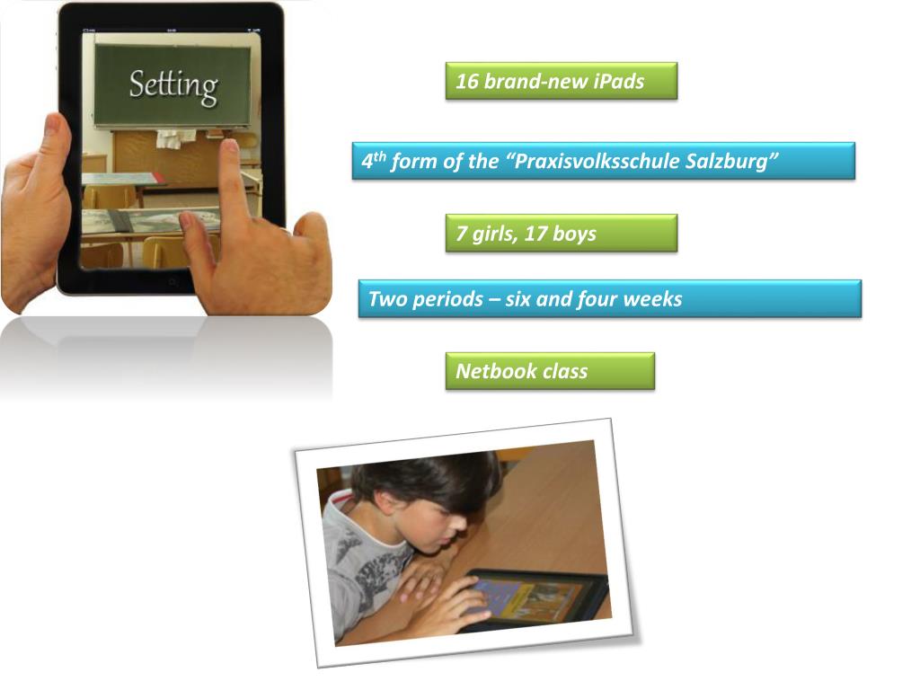 16 brand-new iPads 4th form of the “Praxisvolksschule Salzburg” 7 girls, 17 boys Two periods – six and four weeks Netbook class
