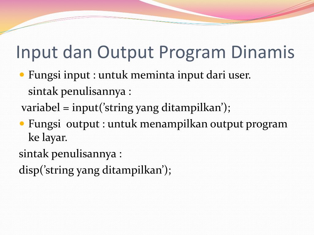 Input dan Output Program Dinamis • Fungsi input : untukmeminta input dari user. sintakpenulisannya : variabel = input(’string yang ditampilkan’); • Fungsi output : untukmenampilkan output program kelayar. sintakpenulisannya : disp(’string yang ditampilkan’);