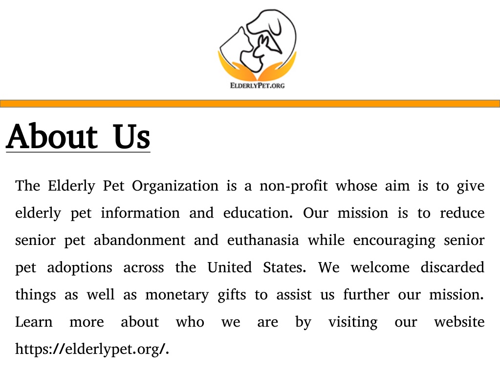 About Us The Elderly Pet Organization is a non-profit whose aim is to give elderly pet information and education. Our mission is to reduce senior pet abandonment and euthanasia while encouraging senior pet adoptions across the United States. We welcome discarded things as well as monetary gifts to assist us further our mission. Learn more about who we are by visiting our website https://elderlypet.org/.