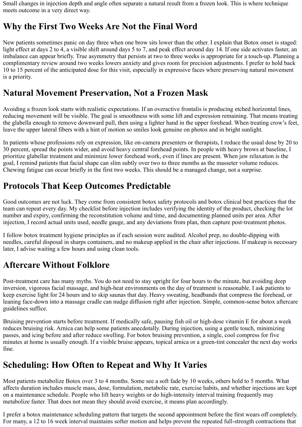 Small changes in injection depth and angle often separate a natural result from a frozen look. This is where technique meets outcome in a very direct way. Why the First Two Weeks Are Not the Final Word New patients sometimes panic on day three when one brow sits lower than the other. I explain that Botox onset is staged: light effect at days 2 to 4, a visible shift around days 5 to 7, and peak effect around day 14. If one side activates faster, an imbalance can appear briefly. True asymmetry that persists at two to three weeks is appropriate for a touch-up. Planning a complimentary review around two weeks lowers anxiety and gives room for precision adjustments. I prefer to hold back 10 to 15 percent of the anticipated dose for this visit, especially in expressive faces where preserving natural movement is a priority. Natural Movement Preservation, Not a Frozen Mask Avoiding a frozen look starts with realistic expectations. If an overactive frontalis is producing etched horizontal lines, reducing movement will be visible. The goal is smoothness with some lift and expression remaining. That means treating the glabella enough to remove downward pull, then using a lighter hand in the upper forehead. When treating crow’s feet, leave the upper lateral fibers with a hint of motion so smiles look genuine on photos and in bright sunlight. In patients whose professions rely on expression, like on-camera presenters or therapists, I reduce the usual dose by 20 to 30 percent, spread the points wider, and avoid heavy central forehead points. In people with heavy brows at baseline, I prioritize glabellar treatment and minimize lower forehead work, even if lines are present. When jaw relaxation is the goal, I remind patients that facial shape can slim subtly over two to three months as the masseter volume reduces. Chewing fatigue can occur briefly in the first two weeks. This should be a managed change, not a surprise. Protocols That Keep Outcomes Predictable Good outcomes are not luck. They come from consistent botox safety protocols and botox clinical best practices that the team can repeat every day. My checklist before injection includes verifying the identity of the product, checking the lot number and expiry, confirming the reconstitution volume and time, and documenting planned units per area. After injection, I record actual units used, needle gauge, and any deviations from plan, then capture post-treatment photos. I follow botox treatment hygiene principles as if each session were audited. Alcohol prep, no double-dipping with needles, careful disposal in sharps containers, and no makeup applied in the chair after injections. If makeup is necessary later, I advise waiting a few hours and using clean tools. Aftercare Without Folklore Post-treatment care has many myths. You do not need to stay upright for four hours to the minute, but avoiding deep inversion, vigorous facial massage, and high-heat environments on the day of treatment is reasonable. I ask patients to keep exercise light for 24 hours and to skip saunas that day. Heavy sweating, headbands that compress the forehead, or leaning face-down into a massage cradle can nudge diffusion right after injection. Simple, common-sense botox aftercare guidelines suffice. Bruising prevention starts before treatment. If medically safe, pausing fish oil or high-dose vitamin E for about a week reduces bruising risk. Arnica can help some patients anecdotally. During injection, using a gentle touch, minimizing passes, and icing before and after reduce swelling. For botox bruising prevention, a single, cool compress for five minutes at home is usually enough. If a visible bruise appears, topical arnica or a green-tint concealer the next day works fine. Scheduling: How Often to Repeat and Why It Varies Most patients metabolize Botox over 3 to 4 months. Some see a soft fade by 10 weeks, others hold to 5 months. What affects duration includes muscle mass, dose, formulation, metabolic rate, exercise habits, and whether injections are kept on a maintenance schedule. People who lift heavy weights or do high-intensity interval training frequently may metabolize faster. That does not mean they should avoid exercise, it means plan accordingly. I prefer a botox maintenance scheduling pattern that targets the second appointment before the first wears off completely. For many, a 12 to 16 week interval maintains softer motion and helps prevent the repeated full-strength contractions that