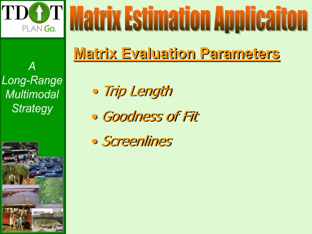 Matrix Estimation Applicaiton Matrix Evaluation Parameters • Trip Length • Goodness of Fit • Screenlines