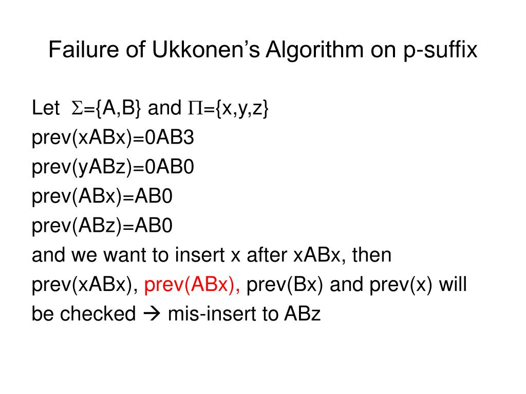 Failure of Ukkonen’s Algorithm on p-suffix Let ={A,B} and ={x,y,z} prev(xABx)=0AB3 prev(yABz)=0AB0 prev(ABx)=AB0 prev(ABz)=AB0 and we want to insert x after xABx, then prev(xABx), prev(ABx), prev(Bx) and prev(x) will be checked mis-insert to ABz