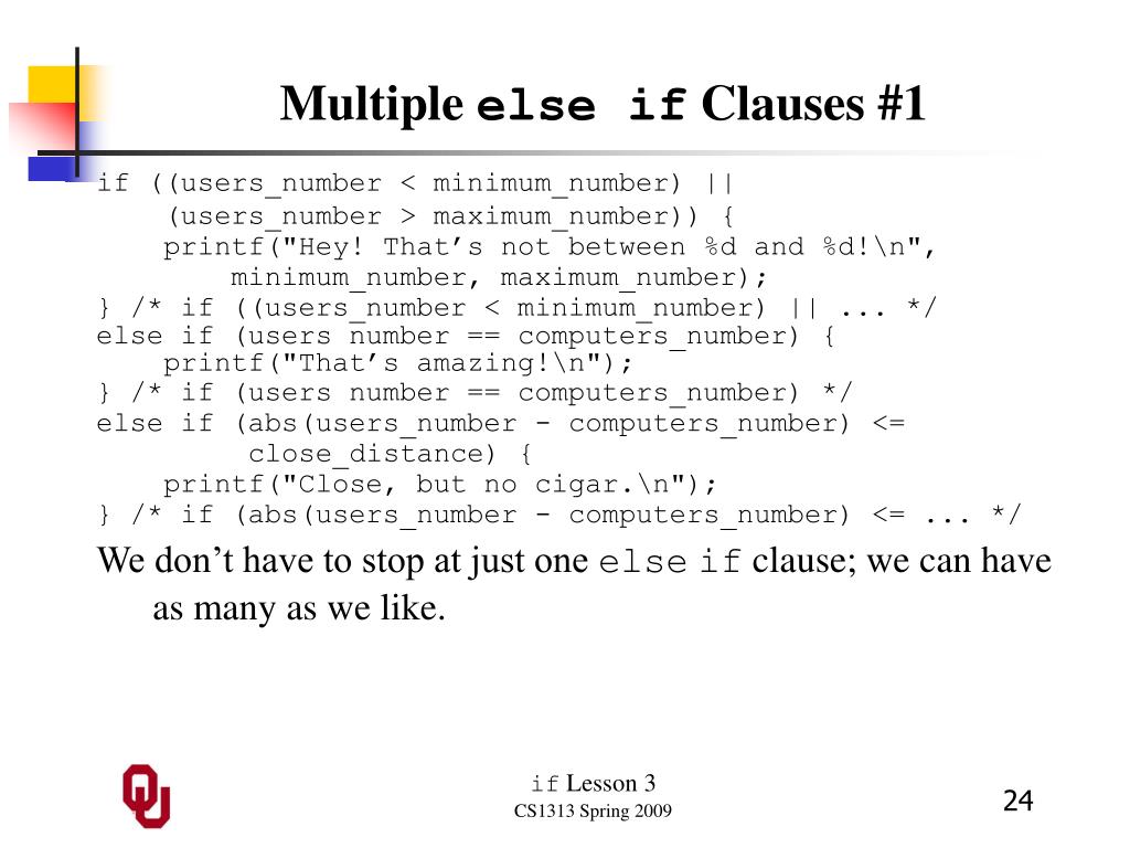 Multiple else if Clauses #1 if ((users_number < minimum_number) || (users_number > maximum_number)) { printf("Hey! That’s not between %d and %d!\n", minimum_number, maximum_number); } /* if ((users_number < minimum_number) || ... */ else if (users number == computers_number) { printf("That’s amazing!\n"); } /* if (users number == computers_number) */ else if (abs(users_number - computers_number) <= close_distance) { printf("Close, but no cigar.\n"); } /* if (abs(users_number - computers_number) <= ... */ We don’t have to stop at just one elseif clause; we can have as many as we like. if Lesson 3 CS1313 Spring 2009