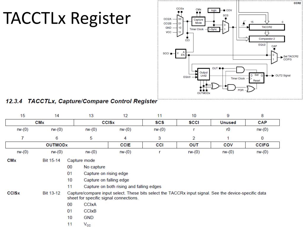 Capture Mode Capture mode (CAP=1) is used to time events on CCIxA or CCIxB (where x is the CCR register). On a rising edge, falling edge, or both (as determined by CMx) the value of TAR is copied into TACCRx, and the CCIFG flag is set.
