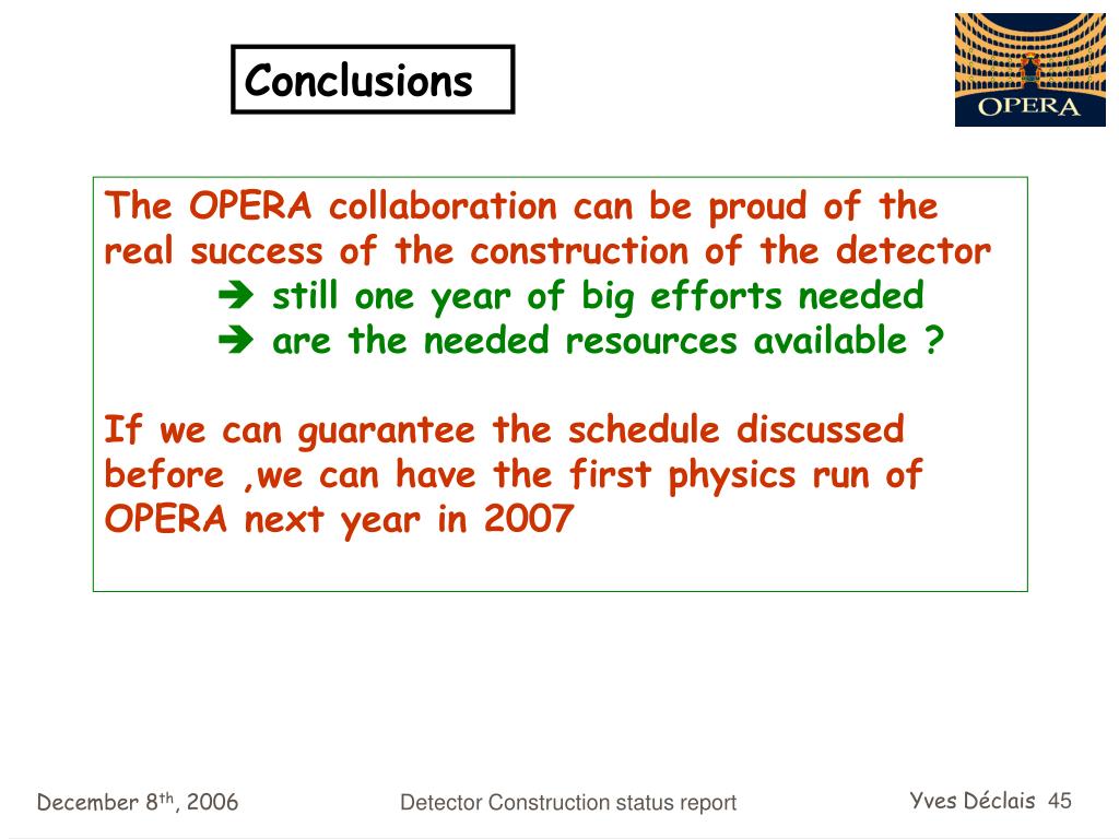 Conclusions The OPERA collaboration can be proud of the real success of the construction of the detector still one year of big efforts needed are the needed resources available ? If we can guarantee the schedule discussed before ,we can have the first physics run of OPERA next year in 2007 Detector Construction status report