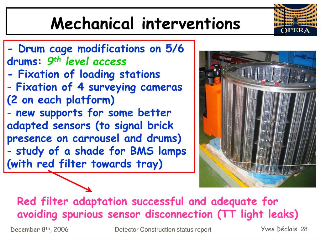 Mechanical interventions • - Drum cage modifications on 5/6 drums: 9th level access • - Fixation of loading stations • Fixation of 4 surveying cameras (2 on each platform) • new supports for some better adapted sensors (to signal brick presence on carrousel and drums) • study of a shade for BMS lamps (with red filter towards tray) Red filter adaptation successful and adequate for avoiding spurious sensor disconnection (TT light leaks) Detector Construction status report