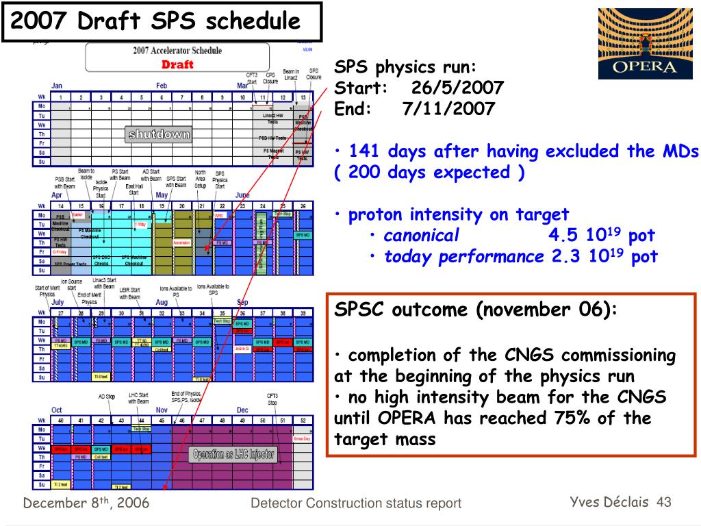2007 Draft SPS schedule • SPS physics run: • Start: 26/5/2007 • End: 7/11/2007 • 141 days after having excluded the MDs • ( 200 days expected ) • proton intensity on target • canonical 4.5 1019 pot • today performance 2.3 1019 pot • SPSC outcome (november 06): • completion of the CNGS commissioning at the beginning of the physics run • no high intensity beam for the CNGS until OPERA has reached 75% of the target mass Detector Construction status report
