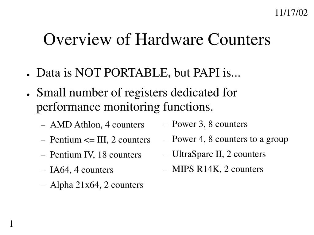 Overview of Hardware Counters • Data is NOT PORTABLE, but PAPI is... • Small number of registers dedicated for performance monitoring functions. • AMD Athlon, 4 counters • Pentium <= III, 2 counters • Pentium IV, 18 counters • IA64, 4 counters • Alpha 21x64, 2 counters • Power 3, 8 counters • Power 4, 8 counters to a group • UltraSparc II, 2 counters • MIPS R14K, 2 counters
