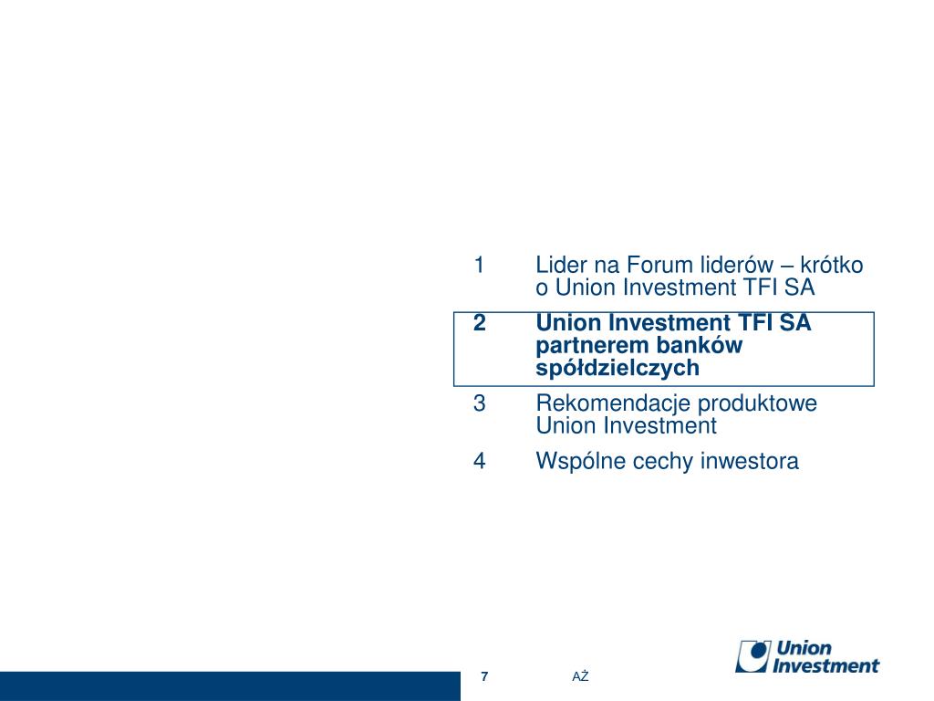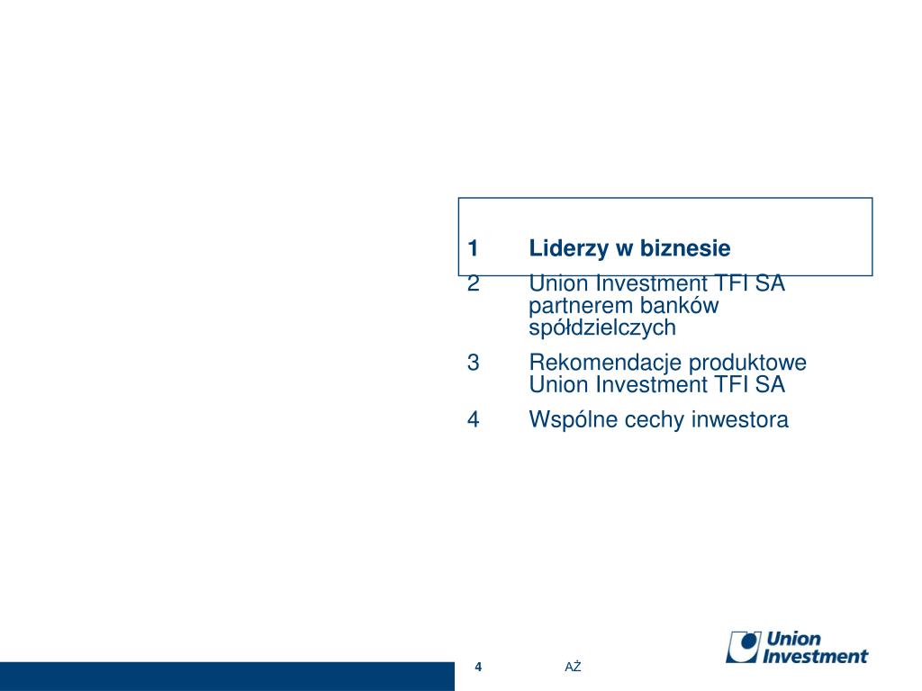 Liderzy w biznesie • Union Investment TFI SA partnerem banków spółdzielczych • Rekomendacje produktowe Union Investment TFI SA • Wspólne cechy inwestora AŻ