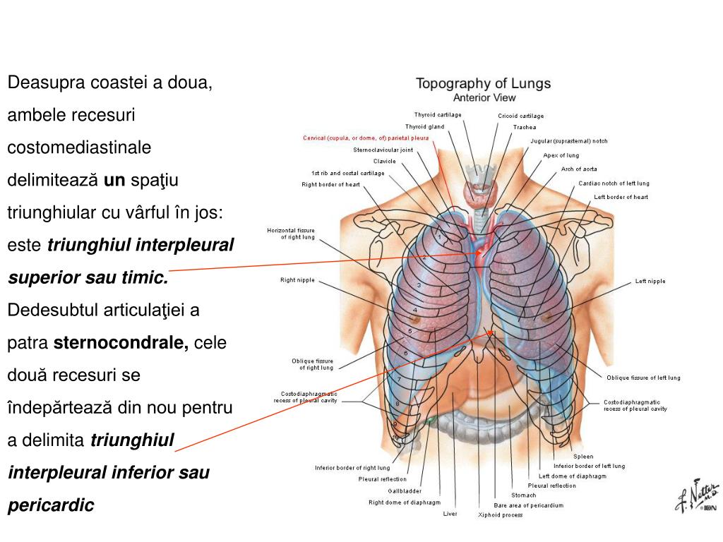Deasupra coastei a doua, ambele recesuri costomediastinale delimitează un spaţiu triunghiular cu vârful în jos: este triunghiul interpleural superior sau timic. Dedesubtul articulaţiei a patra sternocondrale, cele două recesuri se îndepărtează din nou pentru a delimita triunghiul interpleural inferior sau pericardic