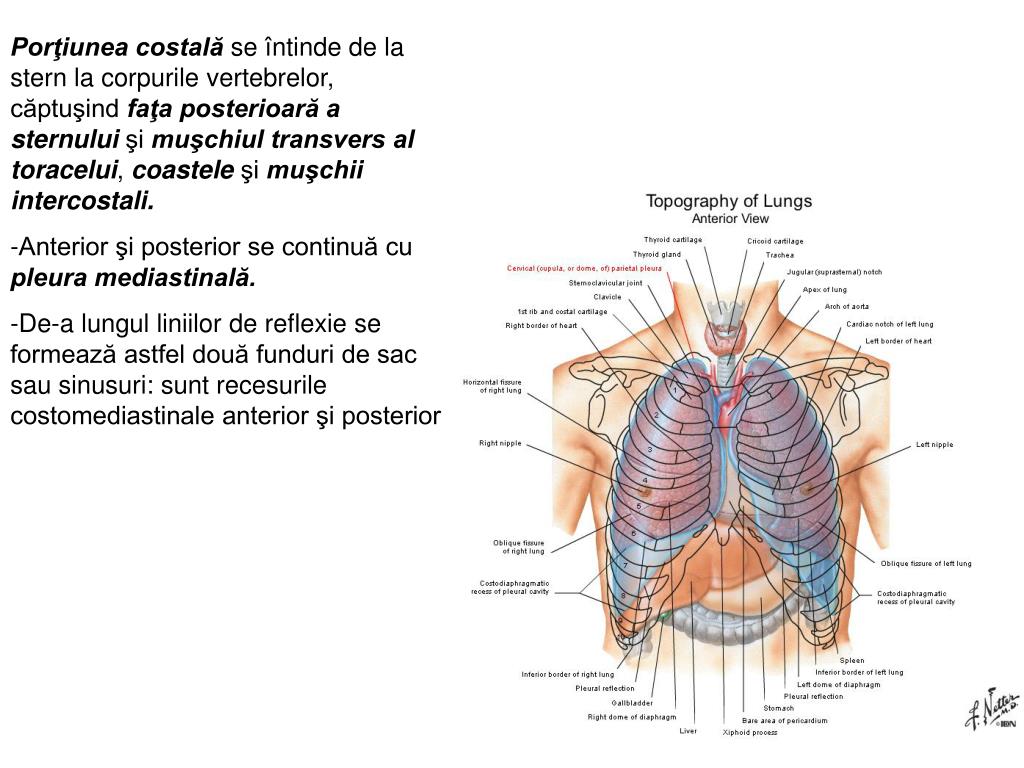 Porţiunea costalăse întinde de la stern la corpurile vertebrelor, căptuşind faţa posterioară a sternului şi muşchiul transvers al toracelui, coastele şi muşchii intercostali. • Anterior şi posterior se continuă cu pleura mediastinală. • De-a lungul liniilor de reflexie se formează astfel două funduri de sac sau sinusuri: sunt recesurile costomediastinale anterior şi posterior