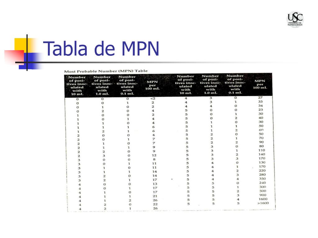 Análisis Semi-Cuantitativo: Estimado del número más probable (MPN) • Este conteo se basa en una estimación de microbios que puede haber por cada 100 ml de agua. Se utilizan unas tablas que estadísticamente estiman la cantidad de tubos fermentados con la cantidad microbial en el agua. • Para realizar este conteo microbial debemos tener 15 tubos con lactosa o con lauril sulfato, que se organizan en tres grupos de 5 tubos con volúmenes de 10 ml, 1 ml y 0.1 ml de la muestra de agua experimental. • Dependiendo de la cantidad de tubos fermentados, se estima la cantidad de microbios/100 ml de agua. • En nuestra investigación todos los tubos fermentaron, así que el número estimado fue mayor de 1,600 coliformes por cada 100ml de las muestras de agua.