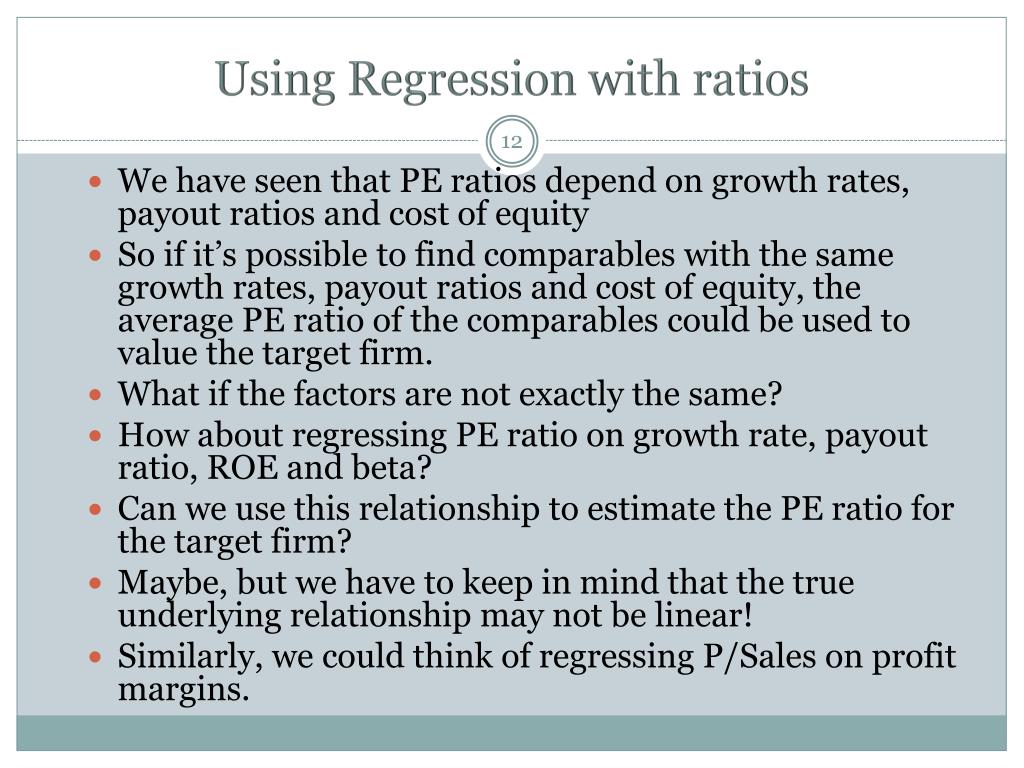 We have seen that PE ratios depend on growth rates, payout ratios and cost of equity So if it’s possible to find comparables with the same growth rates, payout ratios and cost of equity, the average PE ratio of the comparables could be used to value the target firm. What if the factors are not exactly the same? How about regressing PE ratio on growth rate, payout ratio, ROE and beta? Can we use this relationship to estimate the PE ratio for the target firm? Maybe, but we have to keep in mind that the true underlying relationship may not be linear! Similarly, we could think of regressing P/Sales on profit margins. Using Regression with ratios