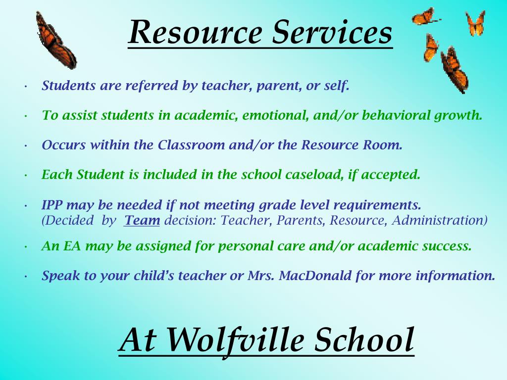 Resource Services • Students are referred by teacher, parent, or self. • To assist students in academic, emotional, and/or behavioral growth. • Occurs within the Classroom and/or the Resource Room. • Each Student is included in the school caseload, if accepted. • IPP may be needed if not meeting grade level requirements. (Decided by Team decision: Teacher, Parents, Resource, Administration) • An EA may be assigned for personal care and/or academic success. • Speak to your child’s teacher or Mrs. MacDonald for more information. At Wolfville School