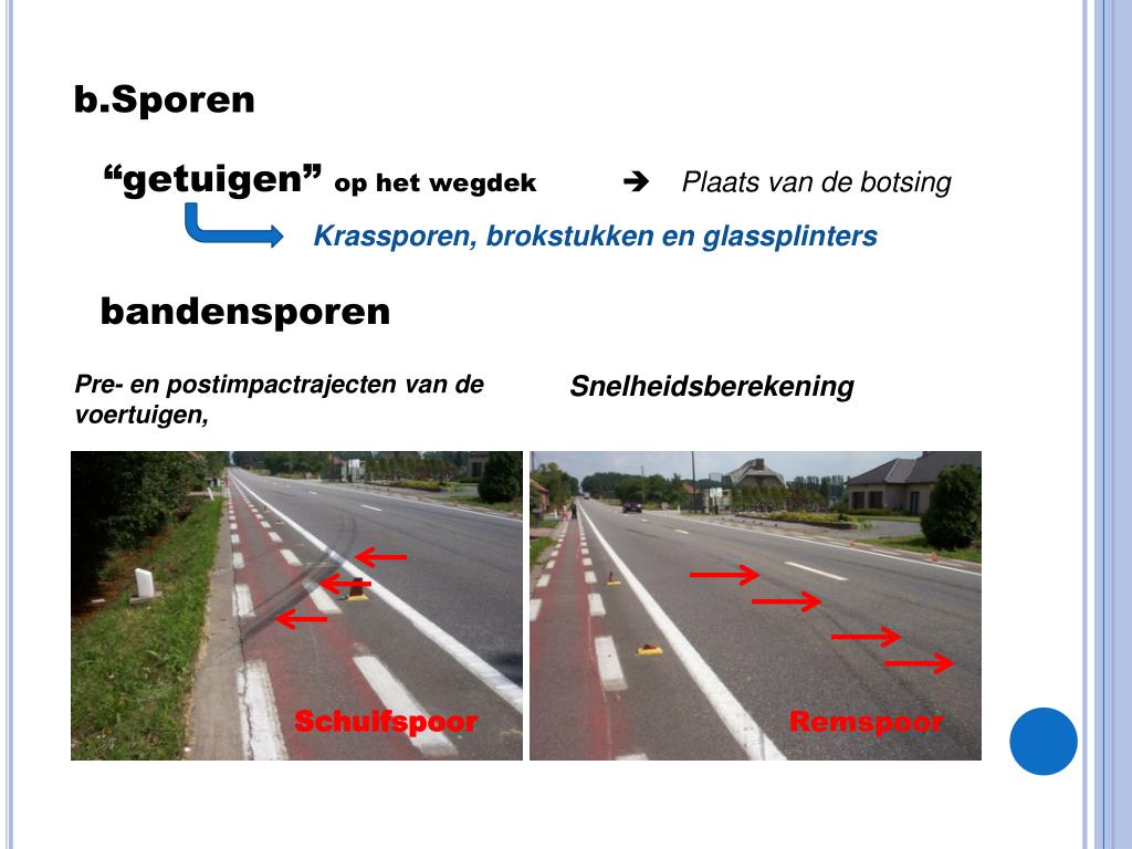 b.Sporen “getuigen” op het wegdek Plaats van de botsing Krassporen, brokstukken en glassplinters bandensporen Pre- en postimpactrajecten van de voertuigen, Snelheidsberekening Schuifspoor Remspoor