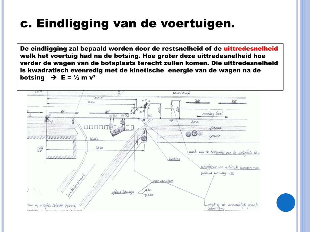 c. Eindligging van de voertuigen. De eindligging zal bepaald worden door de restsnelheid of de uittredesnelheid welk het voertuig had na de botsing. Hoe groter deze uittredesnelheid hoe verder de wagen van de botsplaats terecht zullen komen. Die uittredesnelheid is kwadratisch evenredig met de kinetische energie van de wagen na de botsing E = ½ m v²
