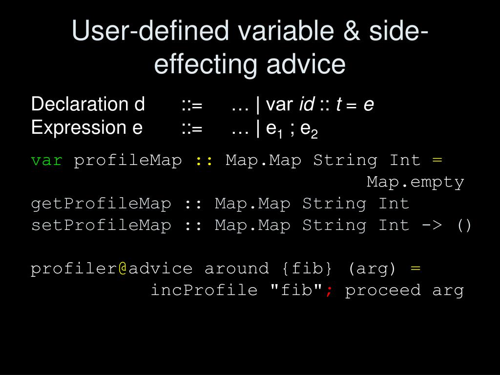 User-defined variable & side-effecting advice Declaration d ::= … | var id :: t = eExpression e ::= … | e1 ; e2 var profileMap :: Map.Map String Int = Map.empty getProfileMap :: Map.Map String Int setProfileMap :: Map.Map String Int -> () profiler@advice around {fib} (arg) = incProfile "fib"; proceed arg