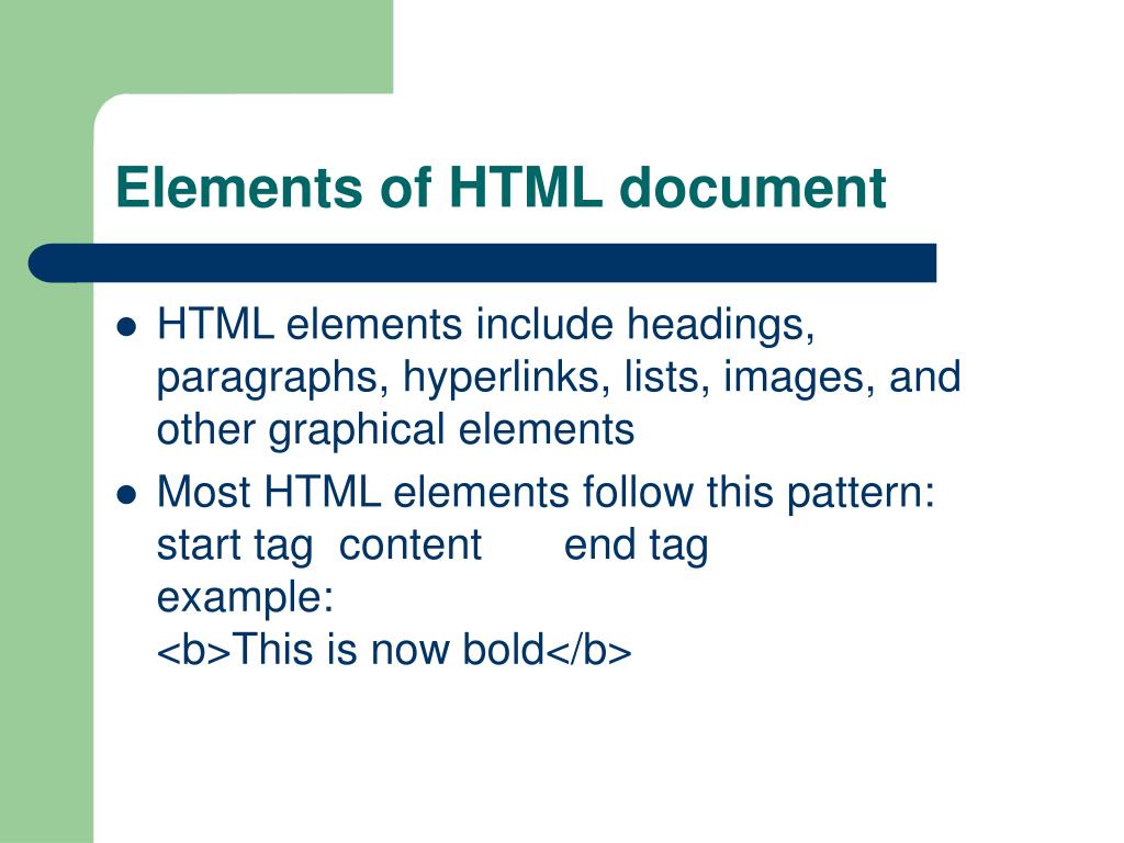 Elements of HTML document • HTML elements include headings, paragraphs, hyperlinks, lists, images, and other graphical elements • Most HTML elements follow this pattern:start tag content end tagexample:<b>This is now bold</b>