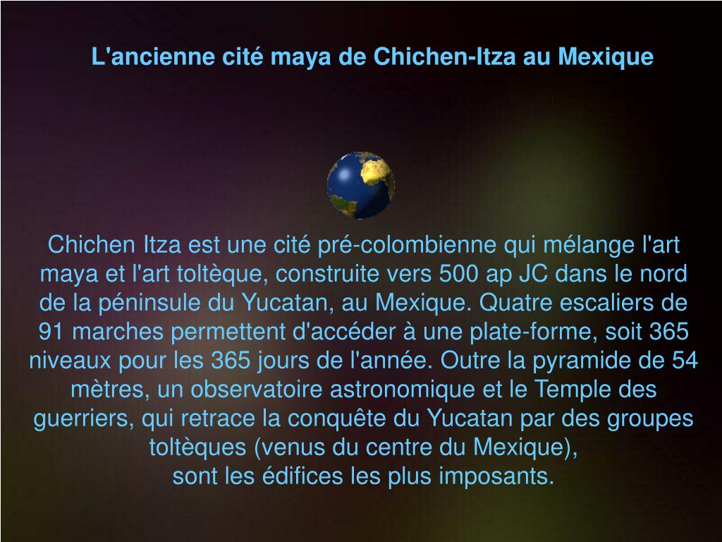L'ancienne cité maya de Chichen-Itza au Mexique Chichen Itza est une cité pré-colombienne qui mélange l'art maya et l'art toltèque, construite vers 500 ap JC dans le nord de la péninsule du Yucatan, au Mexique. Quatre escaliers de 91 marches permettent d'accéder à une plate-forme, soit 365 niveaux pour les 365 jours de l'année. Outre la pyramide de 54 mètres, un observatoire astronomique et le Temple des guerriers, qui retrace la conquête du Yucatan par des groupes toltèques (venus du centre du Mexique), sont les édifices les plus imposants.