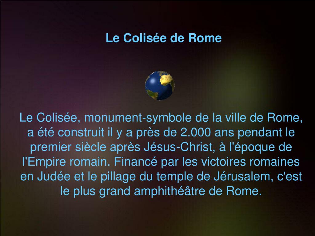 Le Colisée de Rome Le Colisée, monument-symbole de la ville de Rome, a été construit il y a près de 2.000 ans pendant le premier siècle après Jésus-Christ, à l'époque de l'Empire romain. Financé par les victoires romaines en Judée et le pillage du temple de Jérusalem, c'est le plus grand amphithéâtre de Rome.