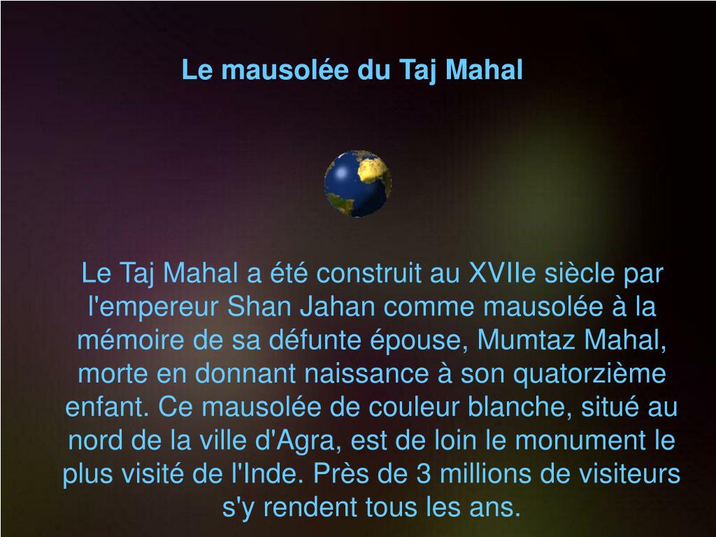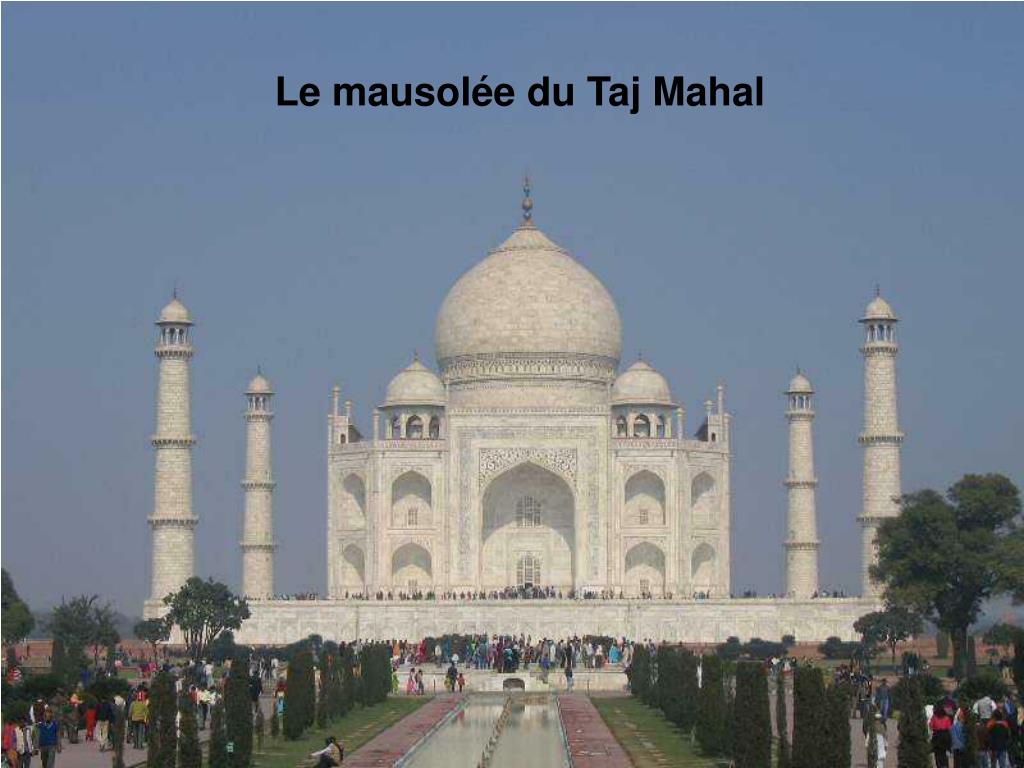 Le mausolée du Taj Mahal Le Taj Mahal a été construit au XVIIe siècle par l'empereur Shan Jahan comme mausolée à la mémoire de sa défunte épouse, Mumtaz Mahal, morte en donnant naissance à son quatorzième enfant. Ce mausolée de couleur blanche, situé au nord de la ville d'Agra, est de loin le monument le plus visité de l'Inde. Près de 3 millions de visiteurs s'y rendent tous les ans.