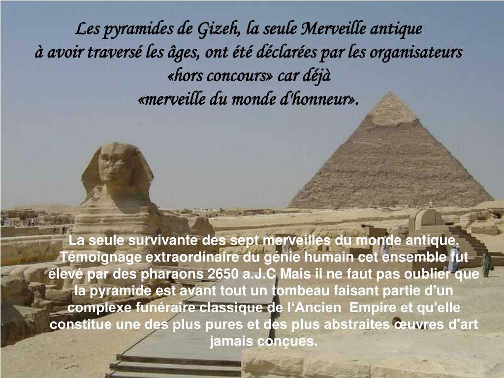 Les pyramides de Gizeh, la seule Merveille antique à avoir traversé les âges, ont été déclarées par les organisateurs «hors concours» car déjà «merveille du monde d'honneur». La seule survivante des sept merveilles du monde antique. Témoignage extraordinaire du génie humain cet ensemble fut élevé par des pharaons 2650 a.J.C Mais il ne faut pas oublier que la pyramide est avant tout un tombeau faisant partie d'un complexe funéraire classique de l‘Ancien Empire et qu'elle constitue une des plus pures et des plus abstraites œuvres d'art jamais conçues.
