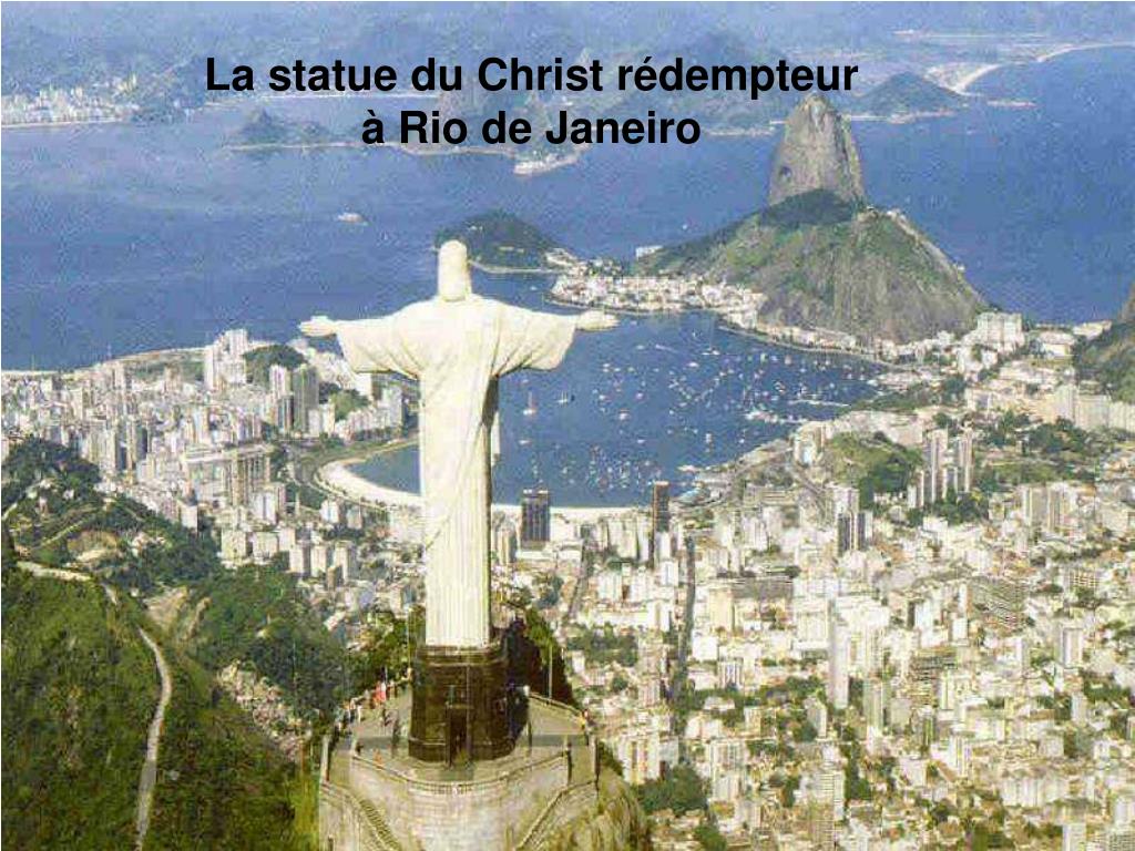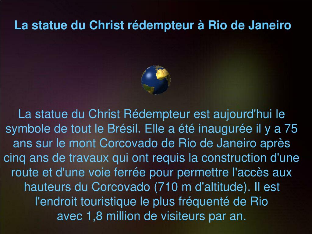 La statue du Christ rédempteur à Rio de Janeiro La statue du Christ Rédempteur est aujourd'hui le symbole de tout le Brésil. Elle a été inaugurée il y a 75 ans sur le mont Corcovado de Rio de Janeiro après cinq ans de travaux qui ont requis la construction d'une route et d'une voie ferrée pour permettre l'accès aux hauteurs du Corcovado (710 m d'altitude). Il est l'endroit touristique le plus fréquenté de Rio avec 1,8 million de visiteurs par an.
