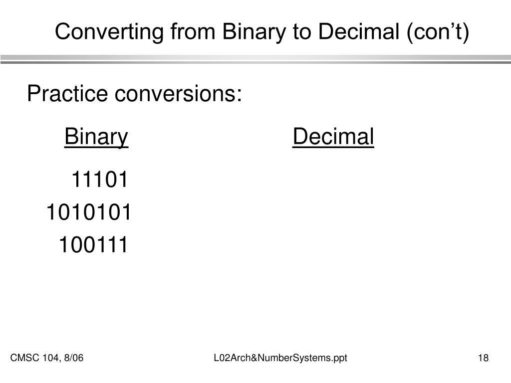 Converting from Binary to Decimal (con’t) Practice conversions: BinaryDecimal 11101 1010101 100111