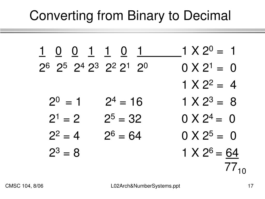 Converting from Binary to Decimal • 1001101 1 X 20 = 1 • 26 25 24 23 22 21 20 0 X 21 = 0 • 1 X 22 = 4 • 20 = 1 24 = 16 1 X 23 = 8 • 21 = 225 = 320 X 24 = 0 • 22 = 426 = 640 X 25 = 0 • 23 = 81 X 26 = 64 7710