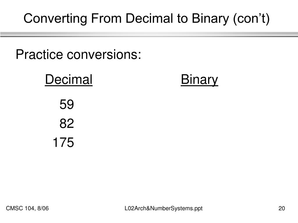 Converting From Decimal to Binary (con’t) Practice conversions: DecimalBinary 59 82 175