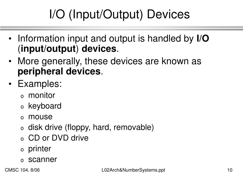 I/O (Input/Output) Devices • Information input and output is handled by I/O (input/output) devices. • More generally, these devices are known as peripheral devices. • Examples: • monitor • keyboard • mouse • disk drive (floppy, hard, removable) • CD or DVD drive • printer • scanner