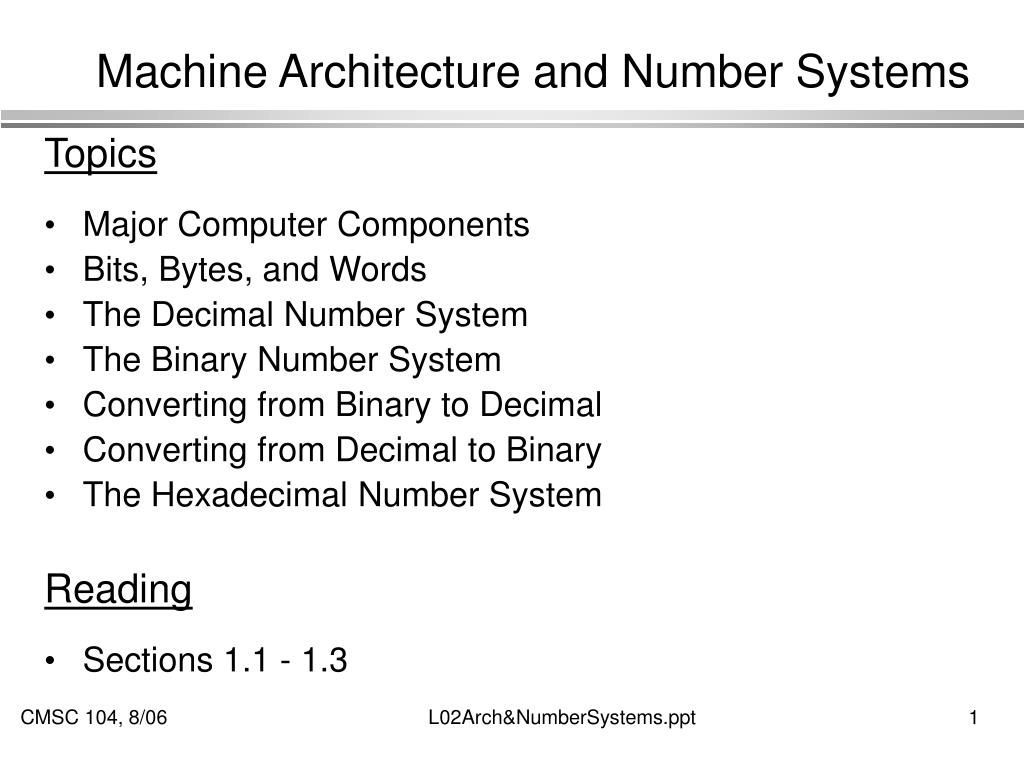 Machine Architecture and Number Systems. Topics Major Computer Components Bits, Bytes, and Words The Decimal Number System The Binary Number System Converting from Binary to Decimal Converting from Decimal to Binary The Hexadecimal Number System Reading Sections 1.1 - 1.3.