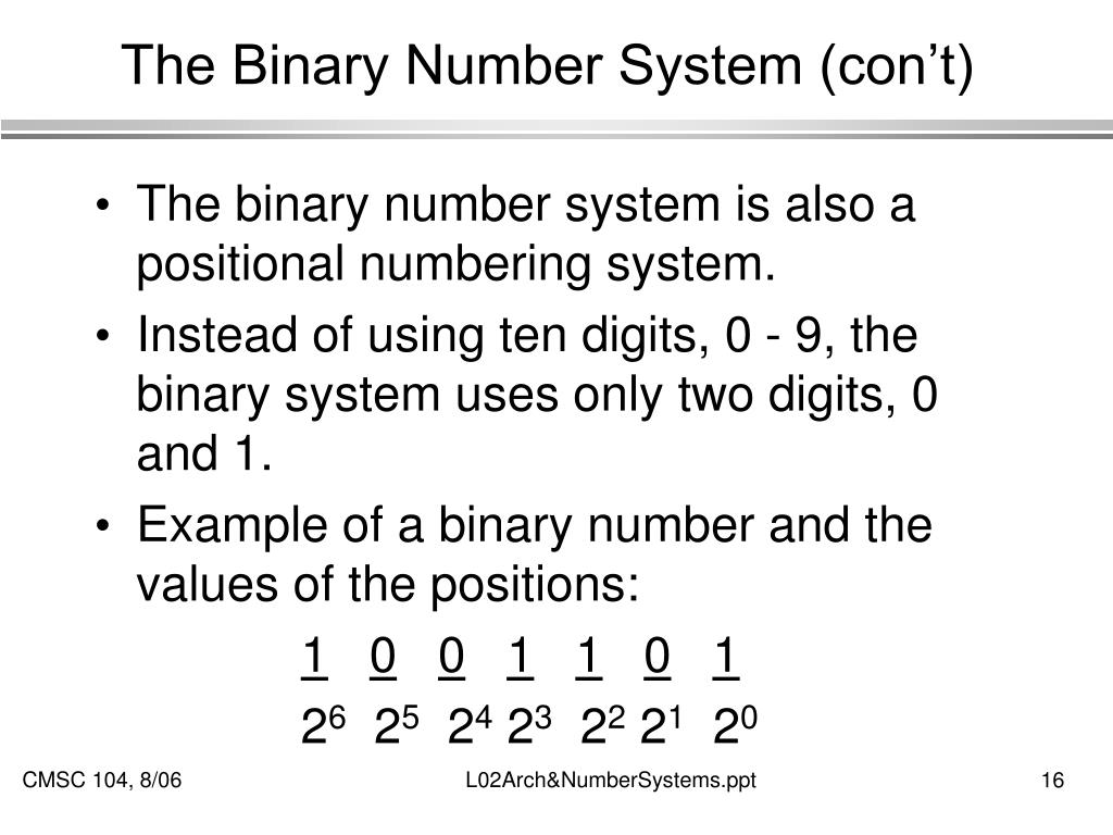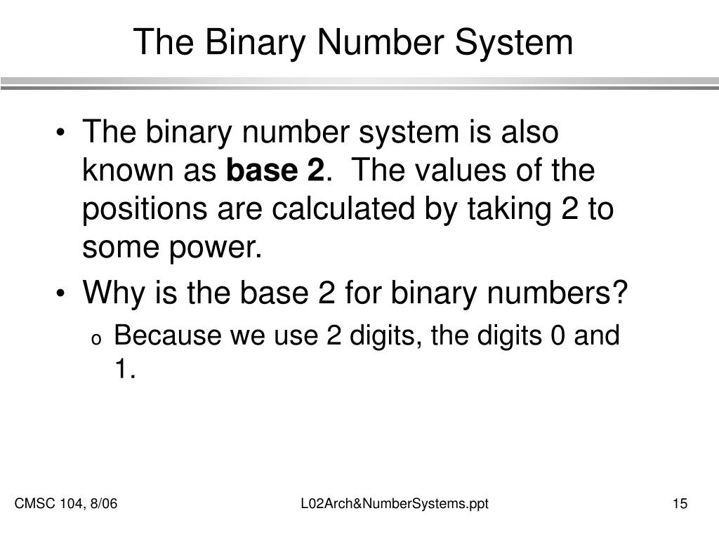 The Binary Number System • The binary number system is also known as base 2. The values of the positions are calculated by taking 2 to some power. • Why is the base 2 for binary numbers? • Because we use 2 digits, the digits 0 and 1.