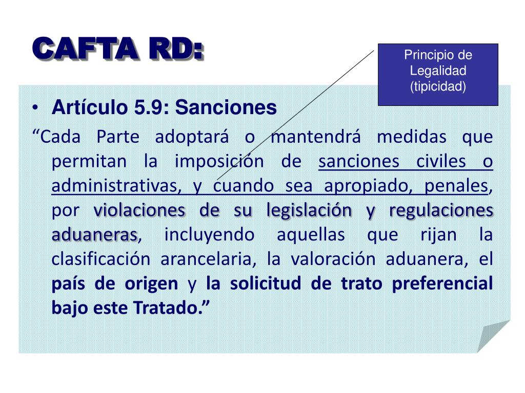 CAFTA RD: Principio de Legalidad (tipicidad) • Artículo 5.9: Sanciones “Cada Parte adoptará o mantendrá medidas que permitan la imposición de sanciones civiles o administrativas, y cuando sea apropiado, penales, por violaciones de su legislación y regulaciones aduaneras, incluyendo aquellas que rijan la clasificación arancelaria, la valoración aduanera, el país de origen y la solicitud de trato preferencial bajo este Tratado.”