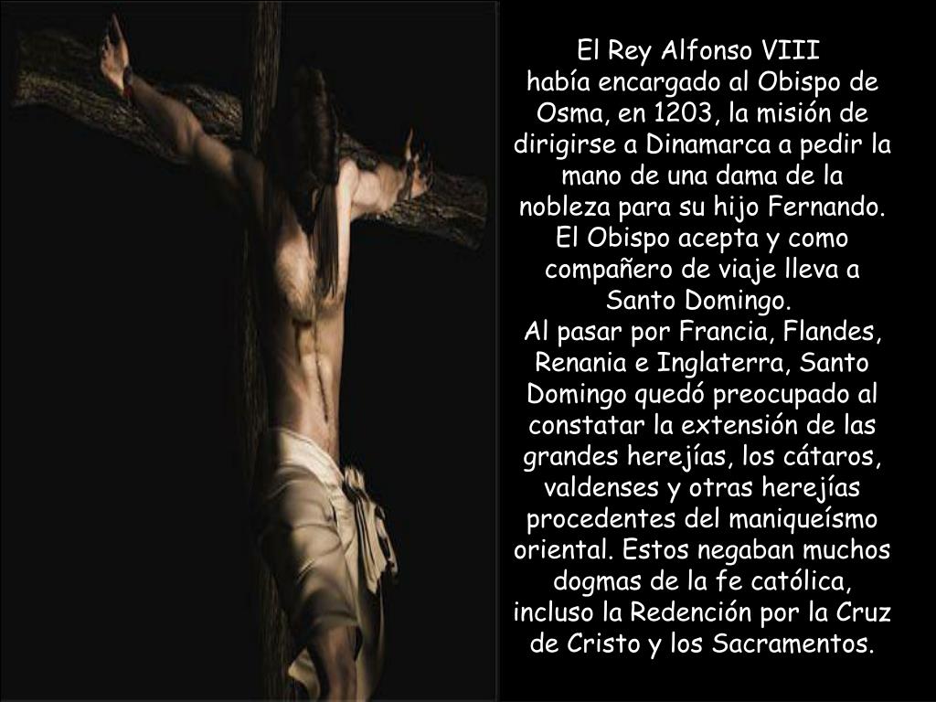 Iglesia del Gesú El Rey Alfonso VIII había encargado al Obispo de Osma, en 1203, la misión de dirigirse a Dinamarca a pedir la mano de una dama de la nobleza para su hijo Fernando. El Obispo acepta y como compañero de viaje lleva a Santo Domingo. Al pasar por Francia, Flandes, Renania e Inglaterra, Santo Domingo quedó preocupado al constatar la extensión de las grandes herejías, los cátaros, valdenses y otras herejías procedentes del maniqueísmo oriental. Estos negaban muchos dogmas de la fe católica, incluso la Redención por la Cruz de Cristo y los Sacramentos.
