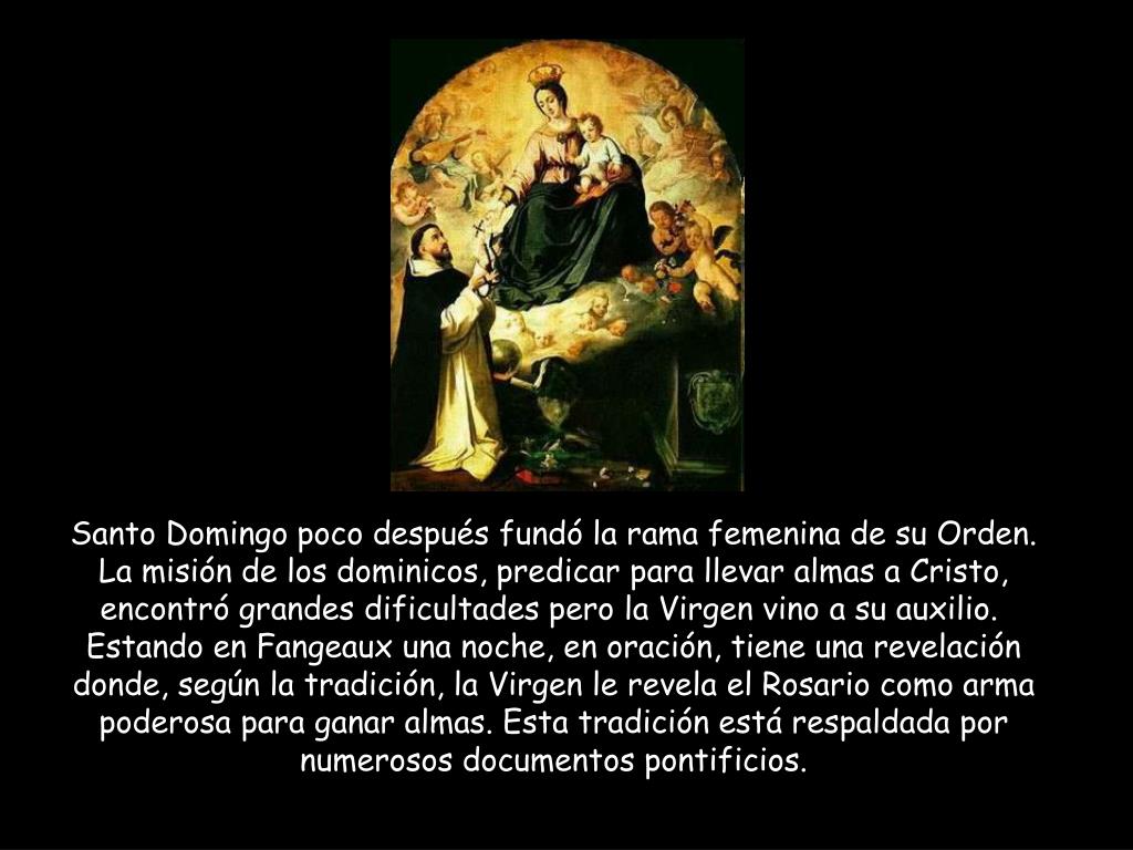 Santo Domingo poco después fundó la rama femenina de su Orden.La misión de los dominicos, predicar para llevar almas a Cristo, encontró grandes dificultades pero la Virgen vino a su auxilio. Estando en Fangeaux una noche, en oración, tiene una revelación donde, según la tradición, la Virgen le revela el Rosario como arma poderosa para ganar almas. Esta tradición está respaldada por numerosos documentos pontificios.