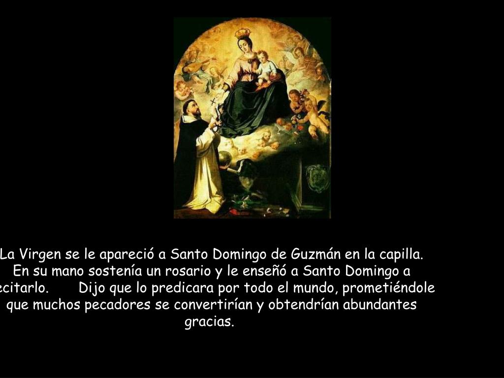 La Virgen se le apareció a Santo Domingo de Guzmán en la capilla. En su mano sostenía un rosario y le enseñó a Santo Domingo a recitarlo. Dijo que lo predicara por todo el mundo, prometiéndole que muchos pecadores se convertirían y obtendrían abundantes gracias.