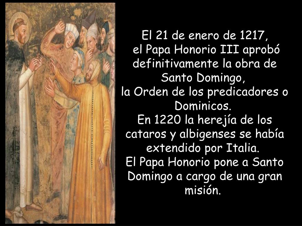 El 21 de enero de 1217, el Papa Honorio III aprobó definitivamente la obra de Santo Domingo, la Orden de los predicadores o Dominicos. En 1220 la herejía de los cataros y albigenses se había extendido por Italia. El Papa Honorio pone a Santo Domingo a cargo de una gran misión.