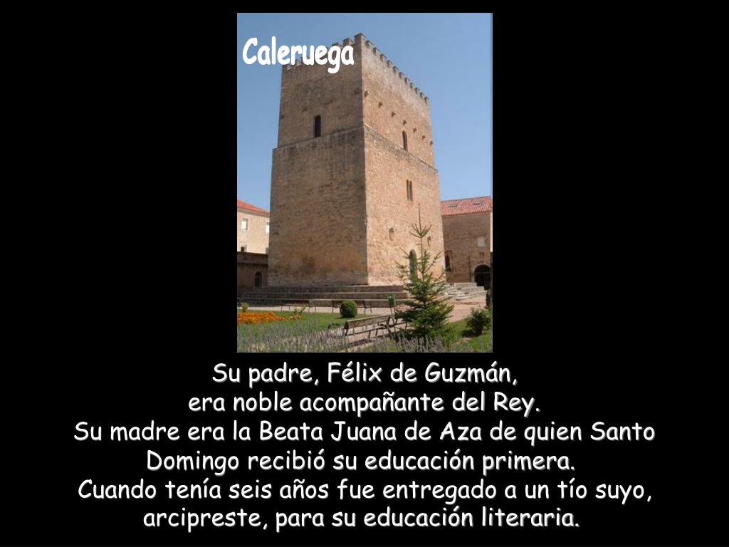 Caleruega Su padre, Félix de Guzmán, era noble acompañante del Rey. Su madre era la Beata Juana de Aza de quien Santo Domingo recibió su educación primera. Cuando tenía seis años fue entregado a un tío suyo, arcipreste, para su educación literaria.