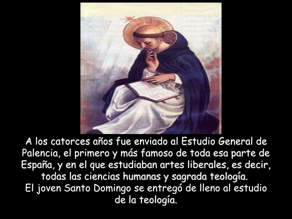 A los catorces años fue enviado al Estudio General de Palencia, el primero y más famoso de toda esa parte de España, y en el que estudiaban artes liberales, es decir, todas las ciencias humanas y sagrada teología. El joven Santo Domingo se entregó de lleno al estudio de la teología.