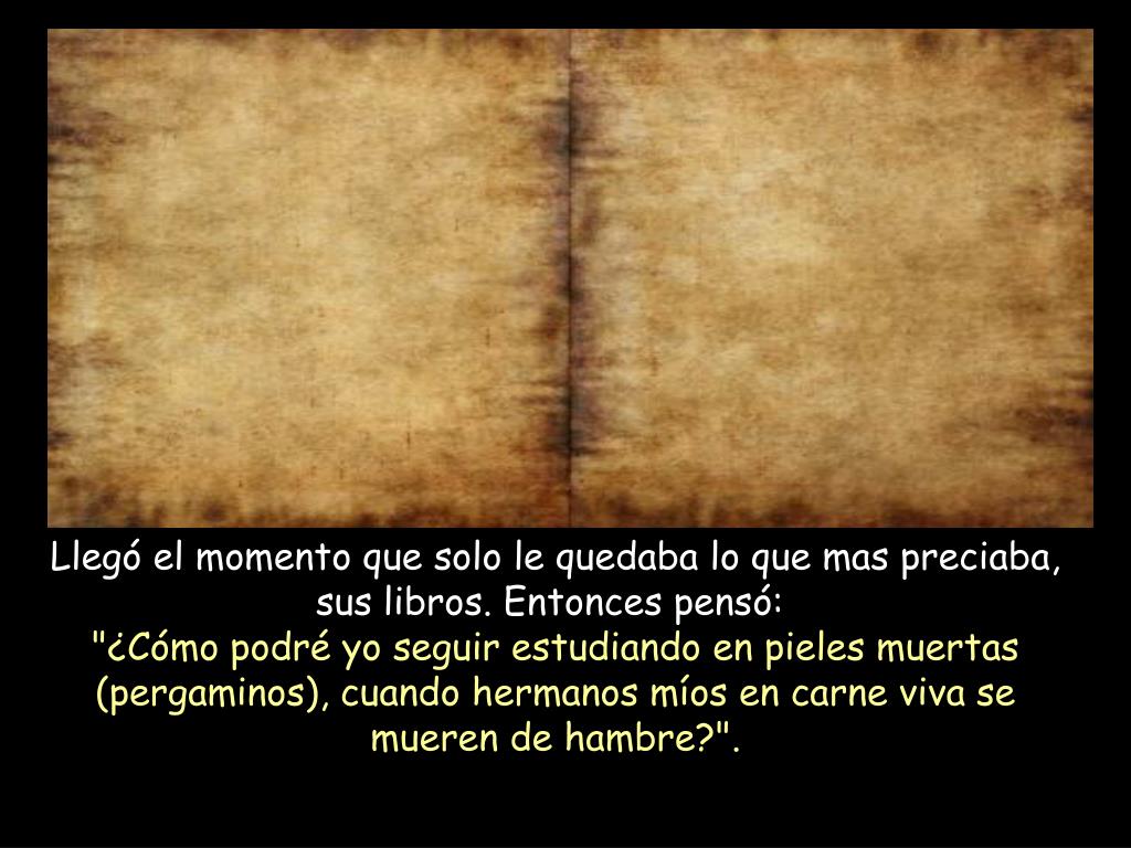 Llegó el momento que solo le quedaba lo que mas preciaba, sus libros. Entonces pensó: "¿Cómo podré yo seguir estudiando en pieles muertas (pergaminos), cuando hermanos míos en carne viva se mueren de hambre?".