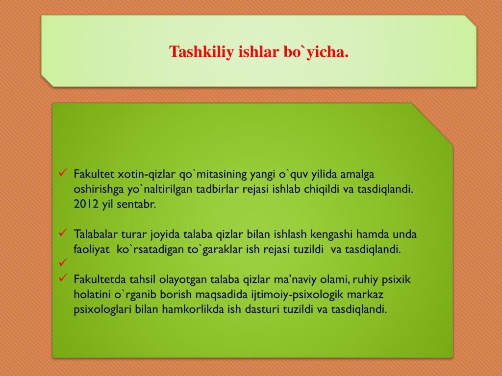 Tashkiliyishlarbo`yicha. • Fakultetxotin-qizlarqo`mitasiningyangio`quvyilidaamalgaoshirishgayo`naltirilgantadbirlarrejasiishlabchiqildivatasdiqlandi. 2012 yilsentabr. • Talabalarturarjoyidatalabaqizlarbilanishlashkengashihamdaundafaoliyatko`rsatadiganto`garaklarishrejasituzildivatasdiqlandi. • Fakultetdatahsilolayotgantalabaqizlarma’naviyolami, ruhiypsixikholatinio`rganibborishmaqsadidaijtimoiy-psixologikmarkazpsixologlaribilanhamkorlikdaishdasturituzildivatasdiqlandi.