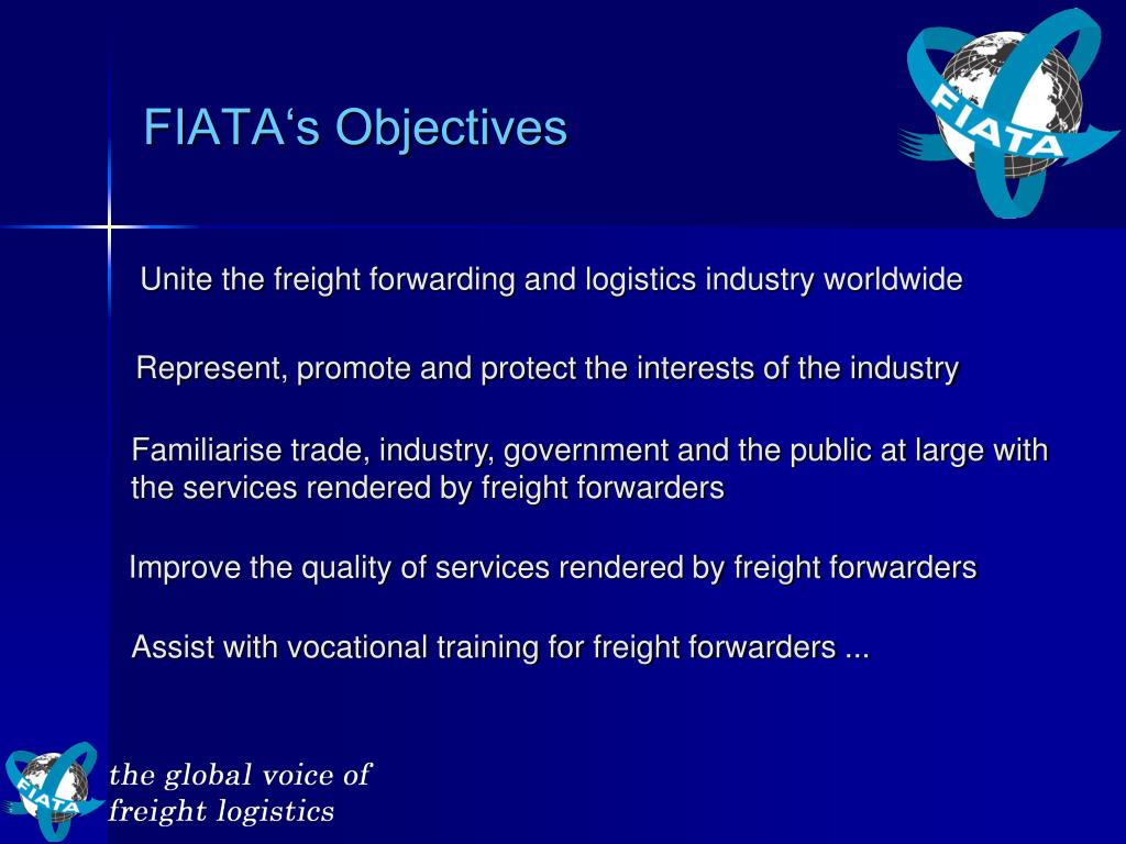 FIATA‘s Objectives Unite the freight forwarding and logistics industry worldwide Represent, promote and protect the interests of the industry Familiarise trade, industry, government and the public at large with the services rendered by freight forwarders Improve the quality of services rendered by freight forwarders Assist with vocational training for freight forwarders ...