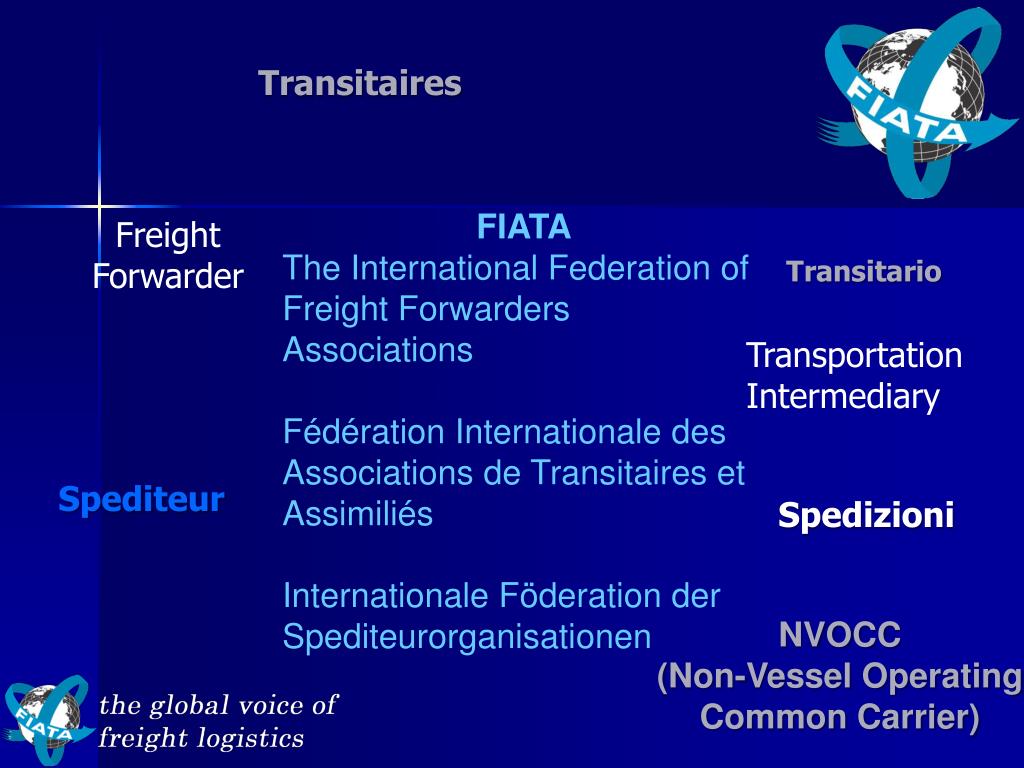 Transitaires FIATA The International Federation of Freight Forwarders Associations Fédération Internationale des Associations de Transitaires et Assimiliés Internationale Föderation der Spediteurorganisationen Freight Forwarder Transitario Transportation Intermediary Spediteur Spedizioni NVOCC (Non-Vessel Operating Common Carrier)