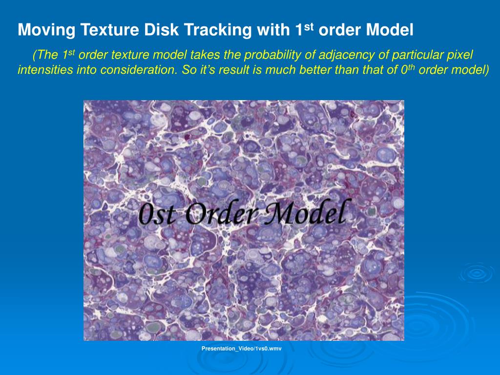 Moving Texture Disk Tracking with 1st order Model (The 1st order texture model takes the probability of adjacency of particular pixel intensities into consideration. So it’s result is much better than that of 0th order model) Presentation_Video/1vs0.wmv