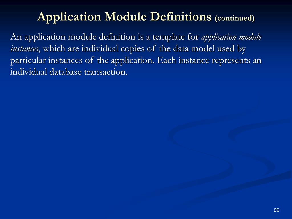 Application Module Definitions(continued) • An application module definition is a template for application module instances, which are individual copies of the data model used by particular instances of the application. Each instance represents an individual database transaction.