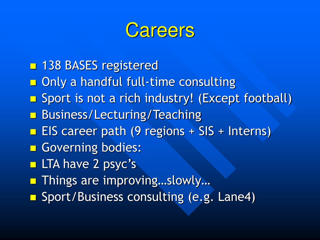 138 BASES registered Only a handful full-time consulting Sport is not a rich industry! (Except football) Business/Lecturing/Teaching EIS career path (9 regions + SIS + Interns) Governing bodies: LTA have 2 psyc’s Things are improving…slowly… Sport/Business consulting (e.g. Lane4) Careers