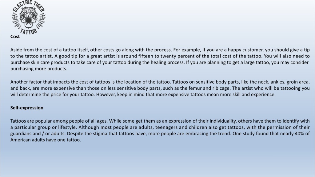 Cost Aside from the cost of a tattoo itself, other costs go along with the process. For example, if you are a happy customer, you should give a tip to the tattoo artist. A good tip for a great artist is around fifteen to twenty percent of the total cost of the tattoo. You will also need to purchase skin care products to take care of your tattoo during the healing process. If you are planning to get a large tattoo, you may consider purchasing more products. Another factor that impacts the cost of tattoos is the location of the tattoo. Tattoos on sensitive body parts, like the neck, ankles, groin area, and back, are more expensive than those on less sensitive body parts, such as the femur and rib cage. The artist who will be tattooing you will determine the price for your tattoo. However, keep in mind that more expensive tattoos mean more skill and experience. Self-expression Tattoos are popular among people of all ages. While some get them as an expression of their individuality, others have them to identify with a particular group or lifestyle. Although most people are adults, teenagers and children also get tattoos, with the permission of their guardians and / or adults. Despite the stigma that tattoos have, more people are embracing the trend. One study found that nearly 40% of American adults have one tattoo.