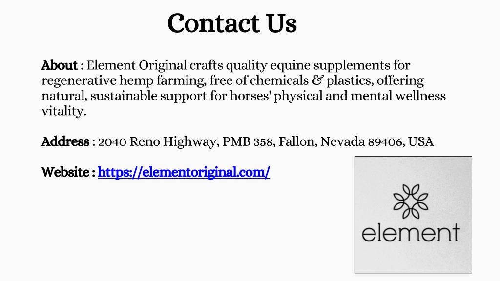 Contact Us About : Element Original crafts quality equine supplements for regenerative hemp farming, free of chemicals & plastics, offering natural, sustainable support for horses' physical and mental wellness vitality. Address : 2040 Reno Highway, PMB 358, Fallon, Nevada 89406, USA Website : https://elementoriginal.com/